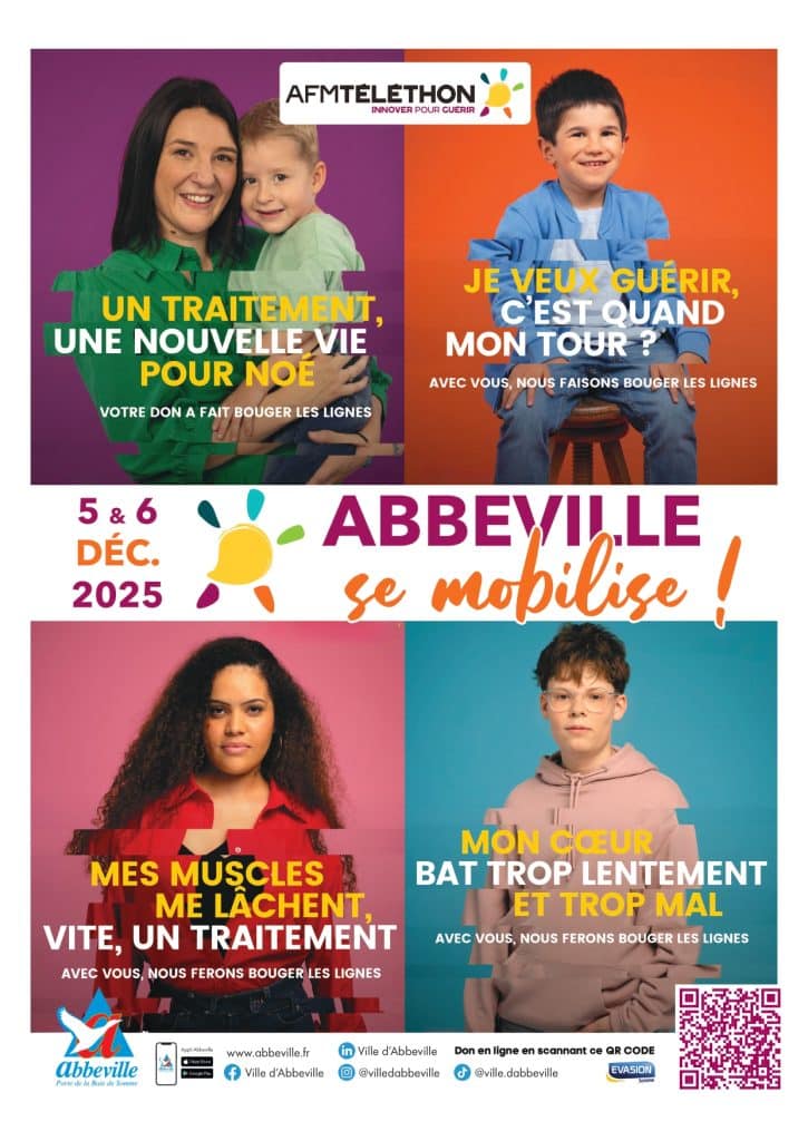 La Ville d’Abbeville renouvelle cette année encore son engagement aux côtés de l’AFM-Téléthon à l’occasion du Téléthon 2025, qui se déroulera les 5 et 6 décembre. Ce rendez-vous annuel de solidarité rassemble citoyens, associations, partenaires et bénévoles autour d’une cause majeure : soutenir la recherche et accompagner les familles touchées par les maladies rares.