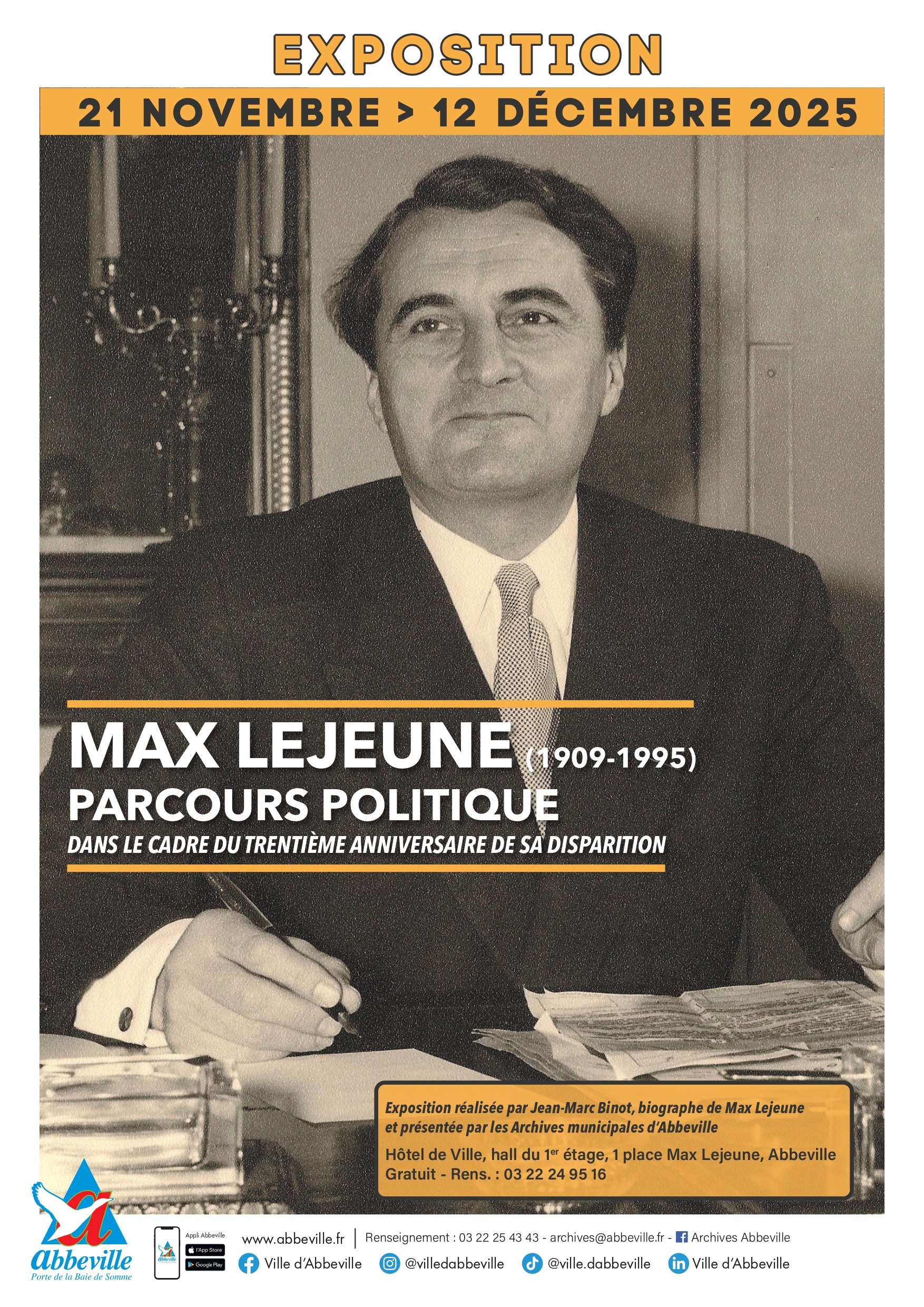 À l’occasion des 30 ans de la disparition de Max Lejeune, l’Hôtel de Ville d’Abbeville lui consacre une exposition exceptionnelle retraçant son parcours politique et son engagement au service de la ville, du département et de la France.