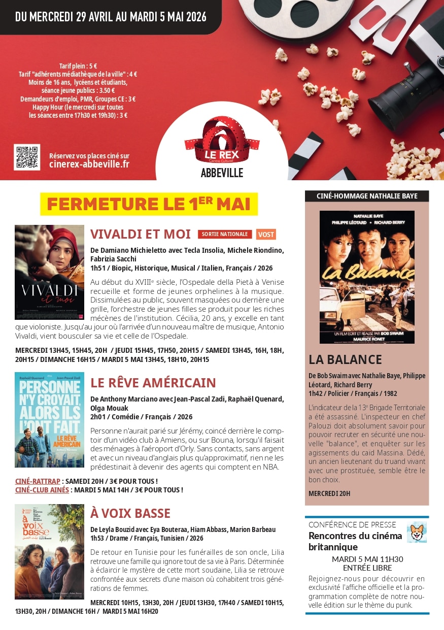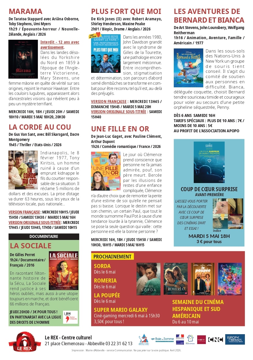 Programme cinéma Le Rex-Centre culturel du 29 avril au 5 mai 2026 Date 29 avril 2026 - 05 mai 2026 Chargement... Heure Journée entière Plus d'Infos Programme Lieu Cinéma Le Rex-Centre Culturel 21 Pl. Clemenceau, 80100 Abbeville Catégorie CINÉMA Programme Partagez cet événement