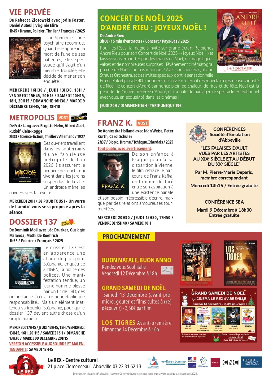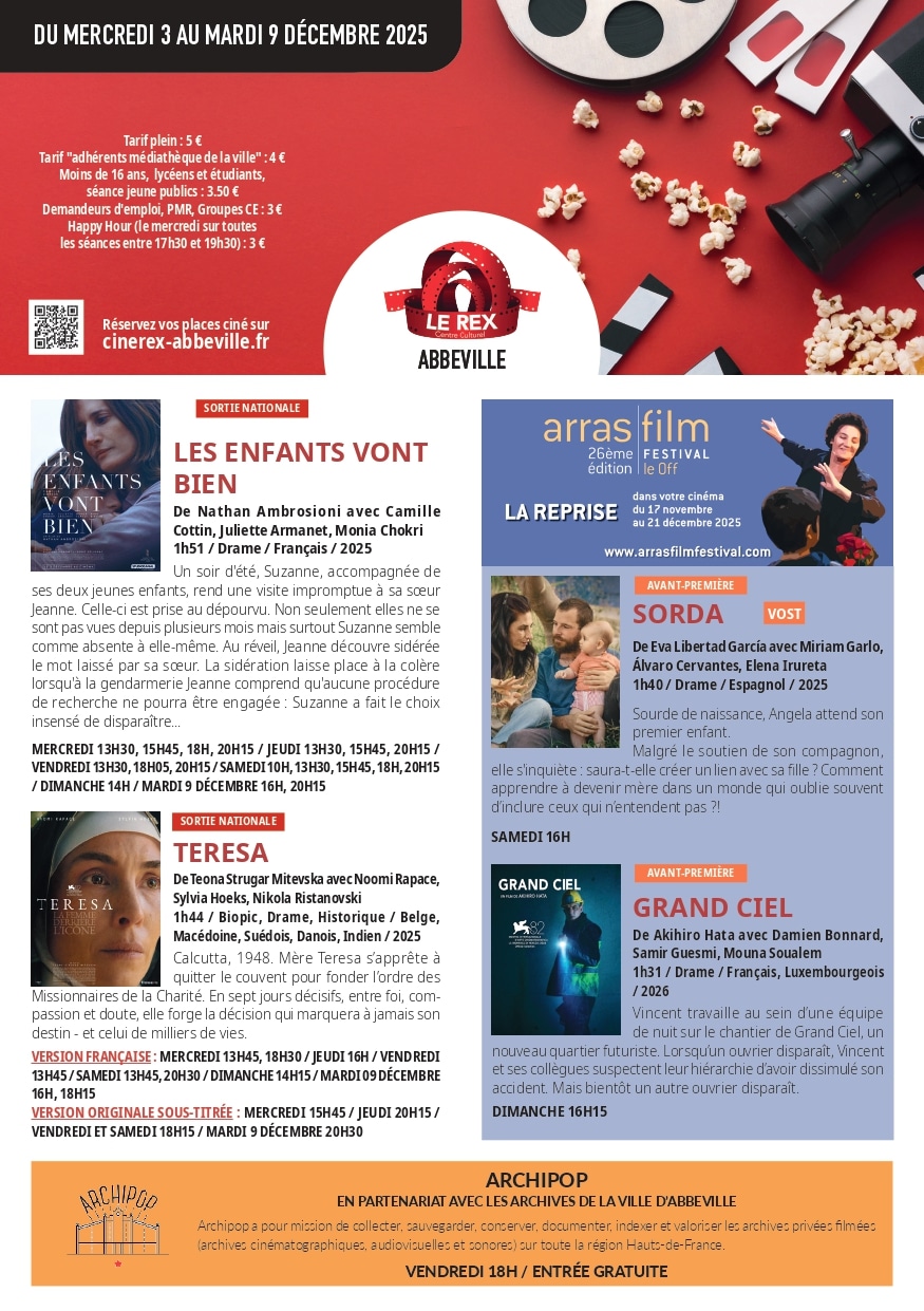Programme cinéma Le Rex-Centre culturel du 3 au 9 décembre 2025 Date 03 - 09 décembre 2025 Chargement... Heure Journée entière Plus d'Infos Programme Lieu Cinéma Le Rex-Centre Culturel 21 Pl. Clemenceau, 80100 Abbeville Catégorie CINÉMA Programme Partagez cet événement