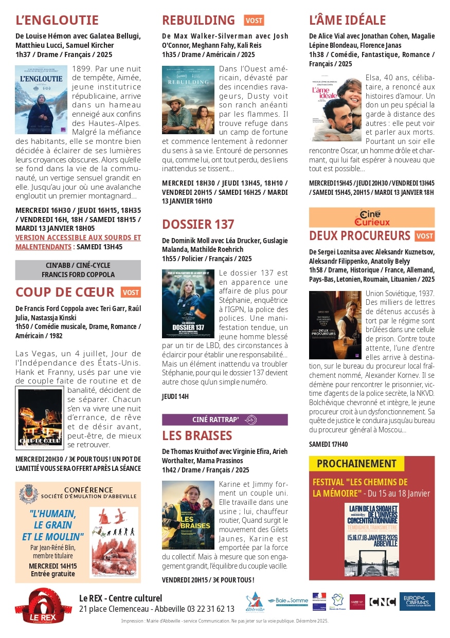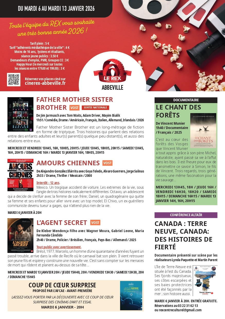 Programme cinéma Le Rex-Centre culturel du 6 au 13 janvier 2026 Date 06 - 13 janvier 2026 Heure Journée entière Plus d'Infos Programme Lieu Cinéma Le Rex-Centre Culturel 21 Pl. Clemenceau, 80100 Abbeville Catégorie CINÉMA Programme Partagez cet événement