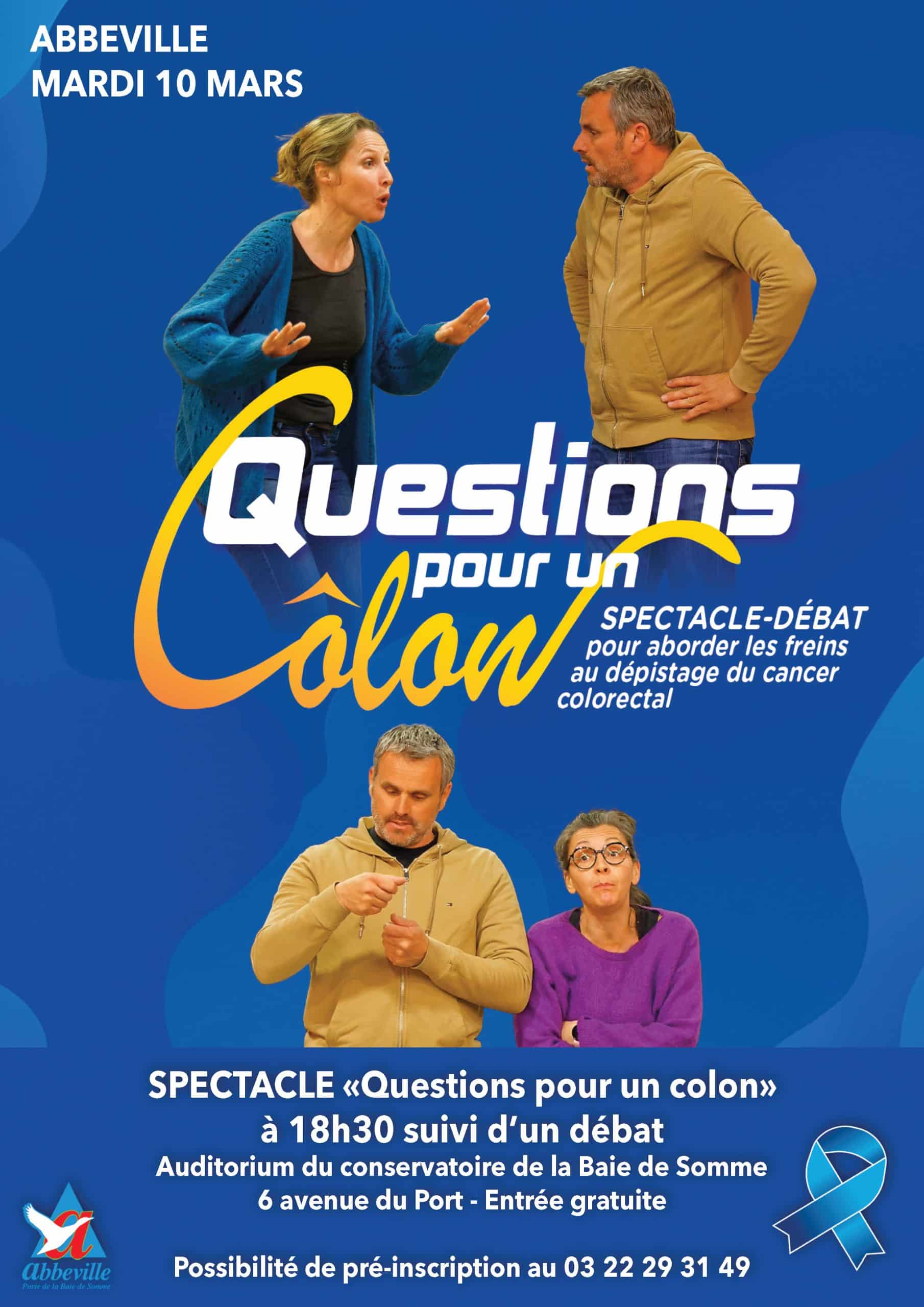 Dans le cadre de Mars Bleu, le mois de sensibilisation au dĂ©pistage du cancer colorectal, la CommunautĂ© d’AgglomĂ©ration de la Baie de Somme vous invite Ă une soirĂ©e unique : un Spectacle-DĂ©bat pour lever les doutes et briser les idĂ©es reçues.