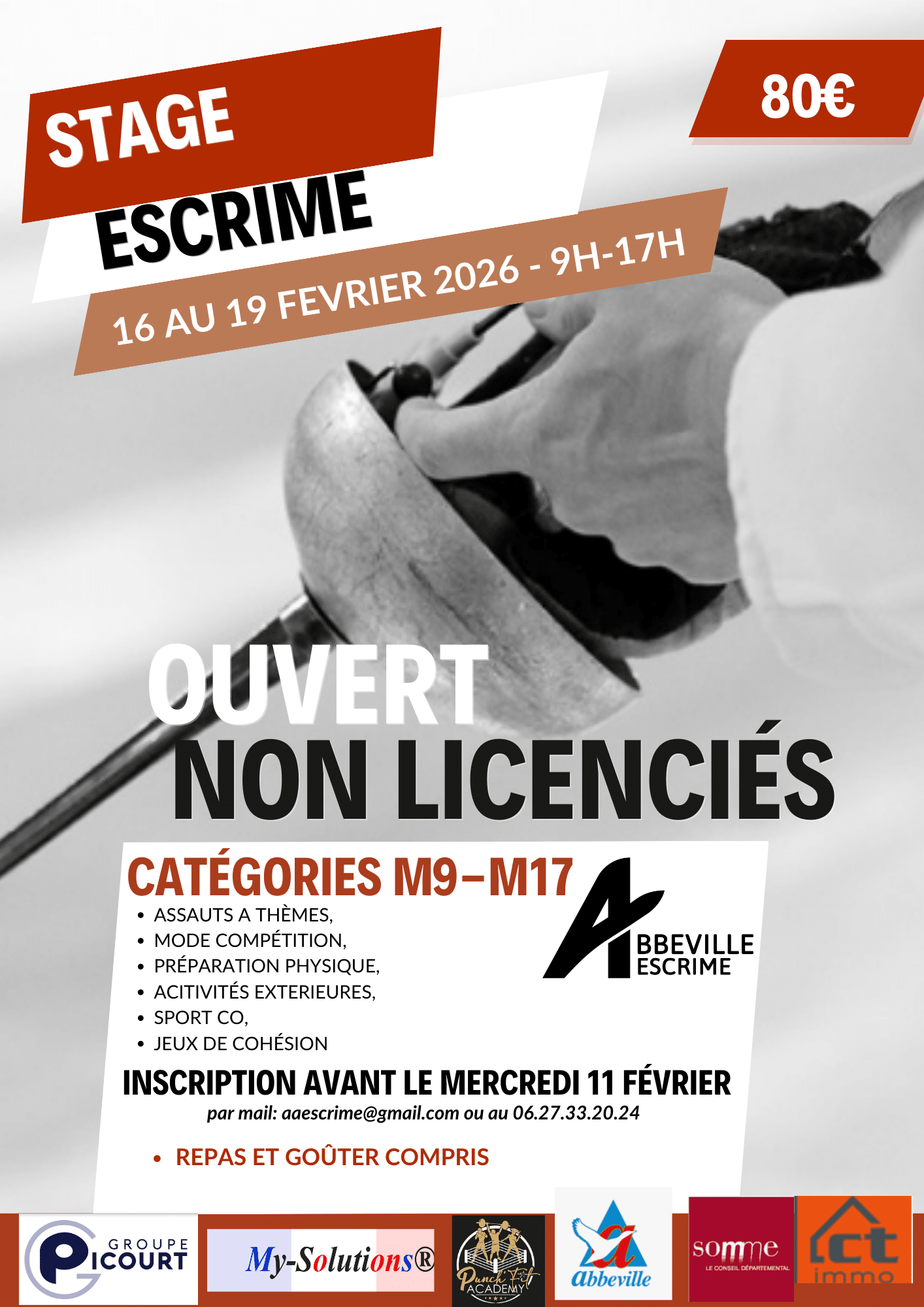 Abbeville Escrime organise un stage ouvert à tous, licenciés ou non, du 16 au 19 février 2026, de 9h à 17h.