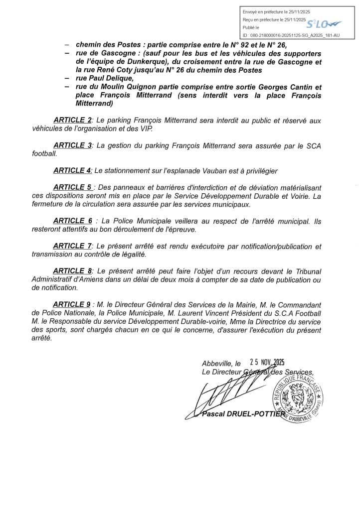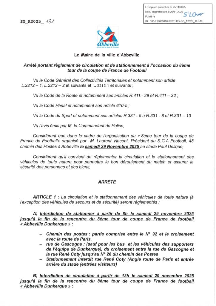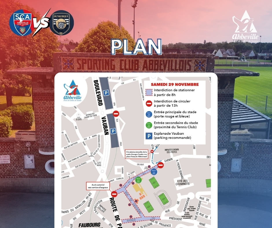 À l’occasion du 8ᵉ tour de la Coupe de France opposant le SC Abbeville à l’USL Dunkerque, la Ville d’Abbeville met en place un dispositif exceptionnel de circulation, de stationnement et d’accès au stade.