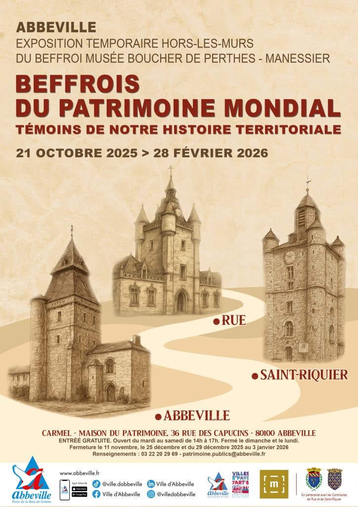 Du 21 octobre 2025 au 28 février 2026, la Chapelle du Carmel vous invite à découvrir une exposition originale consacrée aux beffrois d’Abbeville, Rue et Saint-Riquier. À travers des documents, photographies et maquettes, le public est plongé dans l’histoire et la fonction de ces monuments emblématiques du territoire.